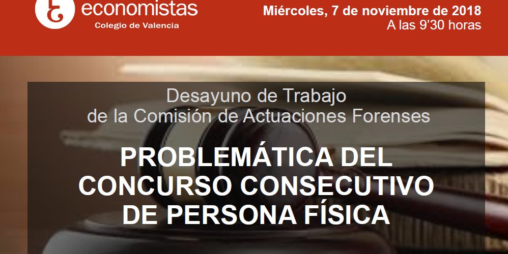 Escribimos esta entrada para informaros de que nuestro socio Fernando Martínez organiza el Desayuno de Trabajo «Problemática del Concurso Consecutivo de Persona Física», que se celebrará en el Colegio de Economistas de Valencia (C/ Martí, 4) el próximo Miércoles, 7 de Noviembre, a las 9.30h.